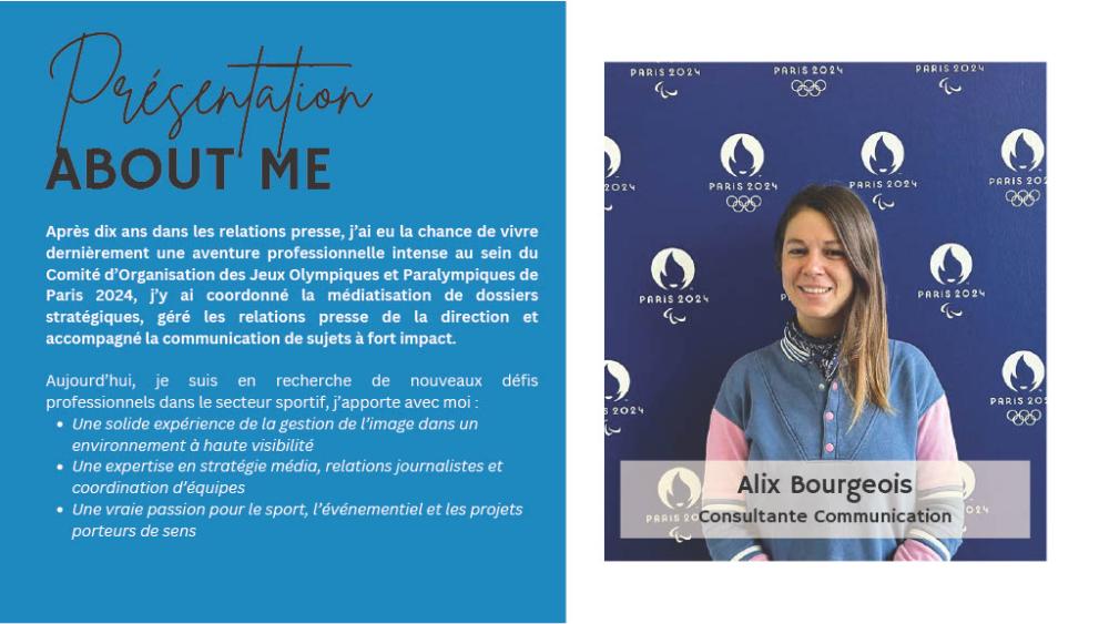 Après plus de 10 ans d’expérience en relations presse — dont un rôle stratégique au cœur des Jeux Olympiques et Paralympiques de Paris 2024 — j’accompagne aujourd’hui les organisations, marques et événements sportifs dans leur communication globale, et tout particulièrement les relations presse et événementielles.