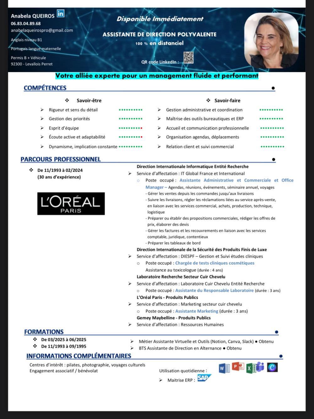 Expérience de 30 ans chez l’Oreal en tant qu’assistante manager / assistante administrative et commerciale / assistante de direction / assistante technique. J’ai toujours travaillé dans cette société et depuis début 2025 je suis à mon compte. Cordialement Anabela Queiros