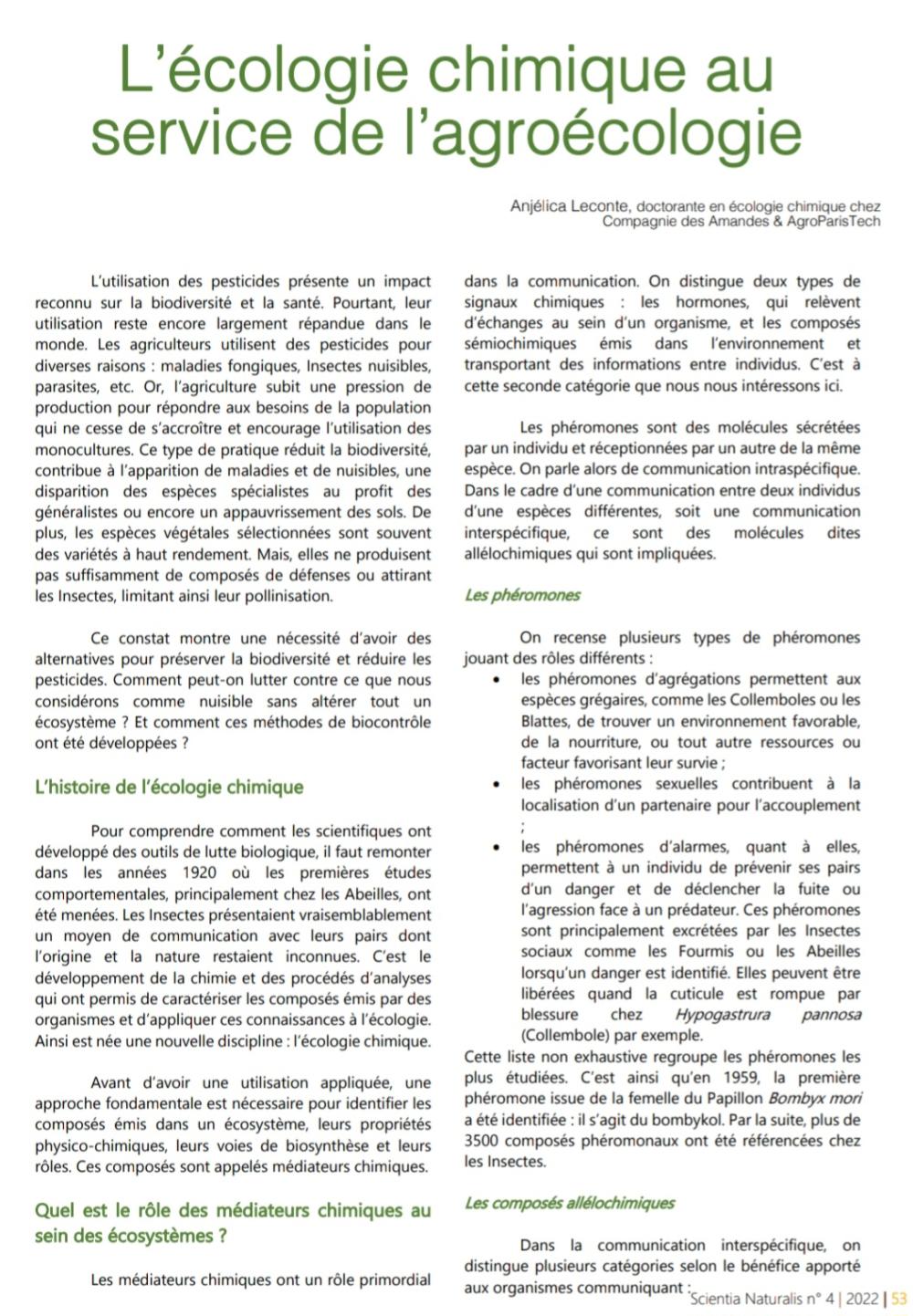 Diplômée d'un master en écologie de Sorbonne Université j'ai poursuivi en thèse CIFRE à AgroParisTech dans ce domaine et je me suis spécialisée en écologie chimique (alternative aux pesticides).