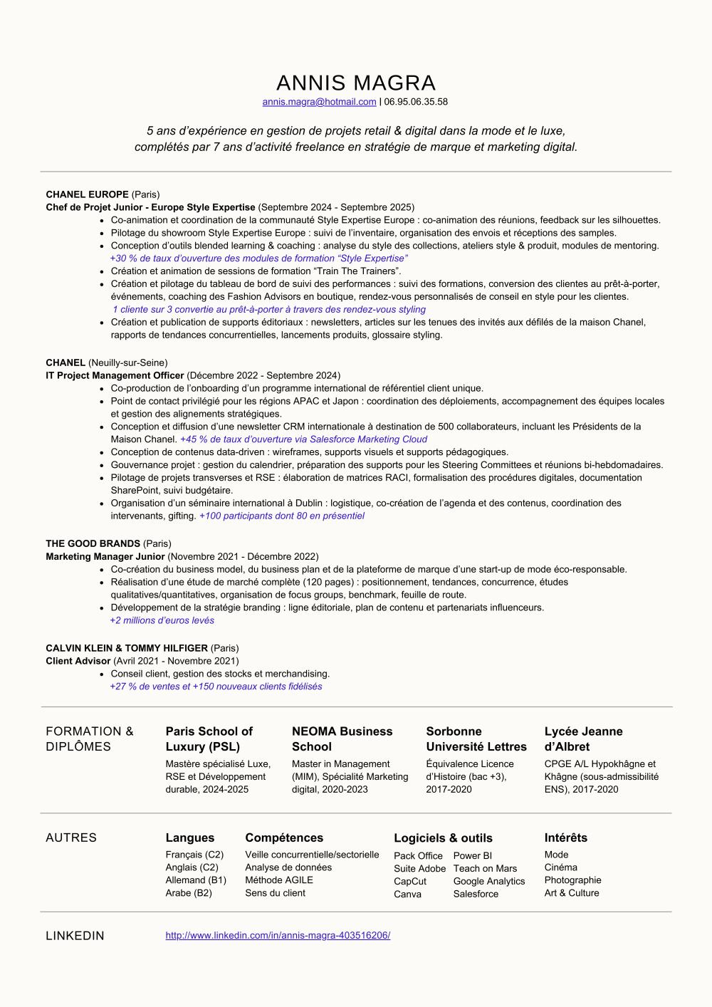 Mon expérience au sein de Chanel m’a permis de développer une expertise solide en pilotage de projets et coordination stratégique. J’y ai occupé le poste de Project Management Officer (PMO) en IT, puis Chef de projet Junior - Fashion Learning & Style Expertise. À ce titre, j’ai contribué au déploiement de programmes mêlant marketing digital, learning et expérience client, destinés à accompagner les équipes retail et à renforcer la performance et la cohérence de la marque.