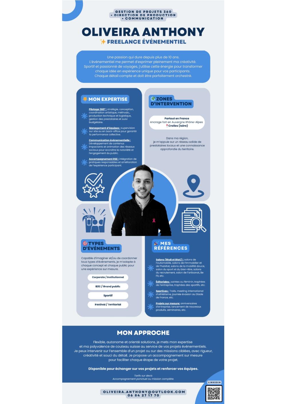 Flexible, autonome et orienté solutions, je mets mon expertise et ma polyvalence de couteau suisse au service de vos projets événementiels. Je peux intervenir sur l’ensemble d’un projet ou sur des missions ciblées, avec rigueur, créativité et souci du détail.