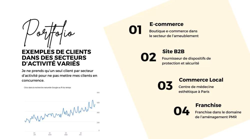 Au fil de mes 12 années d’expérience en référencement naturel, j’ai accompagné des clients issus de secteurs très variés — du B2B au e-commerce, en passant par la franchise et le SaaS.