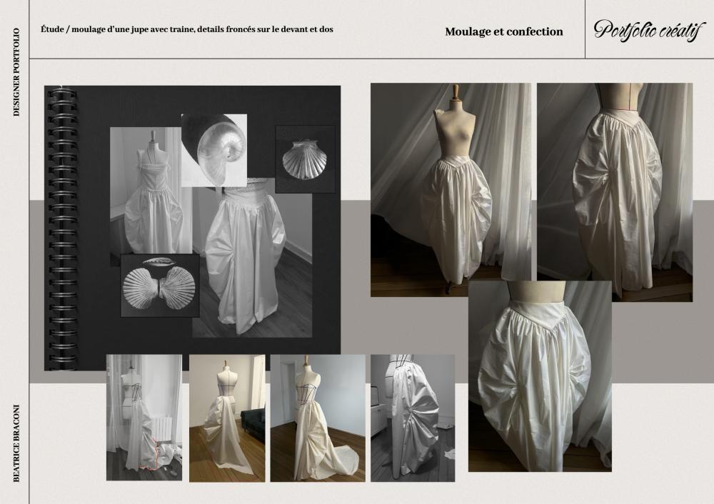 J'interviens en tant que modéliste flou prêt-à-porter: étude et interprétation du croquis, prise de mesures, mise en volume sur mannequin, réalisation et ajustement des toiles, participation aux essayages et contrôle du bien-aller.