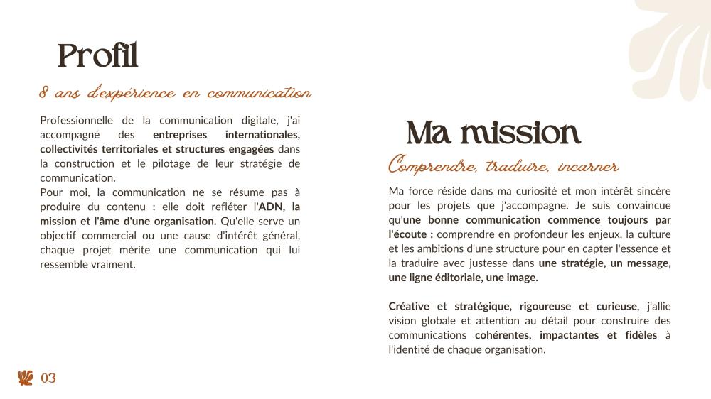 Chargée de communication digitale avec 8 ans d’expérience en communication corporate et marketing digital, j’accompagne les TPE, PME et structures à impact dans le développement d’une communication claire, cohérente et efficace.