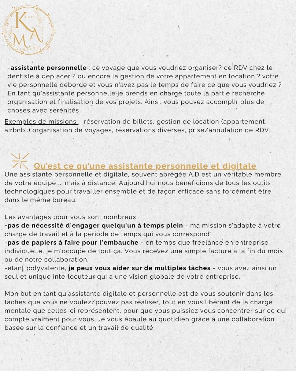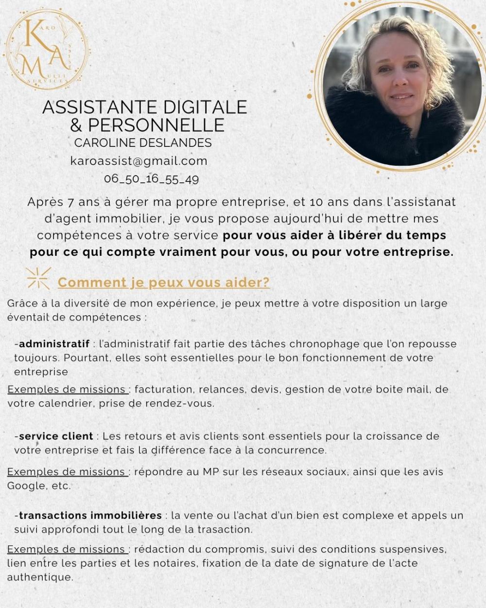 Après 7 ans à gérer ma propre entreprise, et 10 ans dans l’assistanat d’agent immobilier, je vous propose aujourd’hui de mettre mes compétences à votre service pour vous aider à libérer du temps pour ce qui compte vraiment pour vous, ou pour votre entreprise.