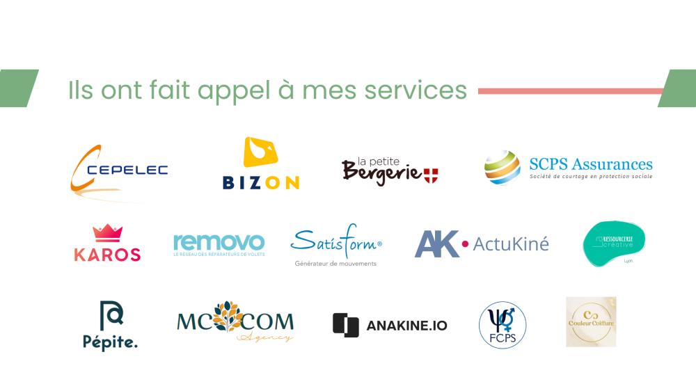 ActuKiné, SCPS Assurances, La Ressourcerie Créative de Lyon, FCPS, Anakine, Karos, Satisform, Cepelec, La Petite Bergerie, Couleur Coiffure, MC COM, Removo, Bizon, etc.