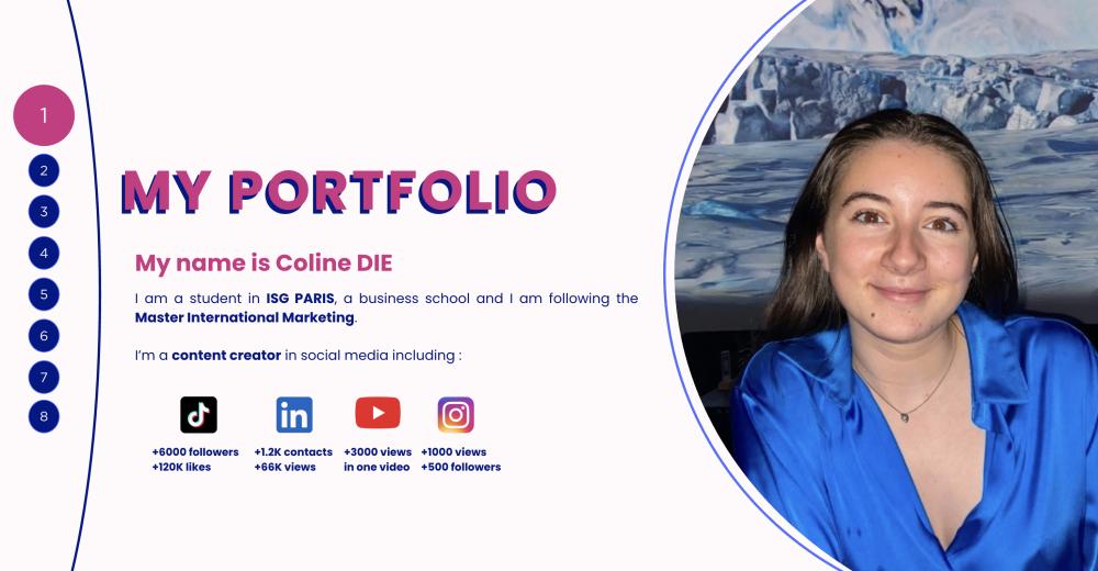 Bonjour, je suis Coline Die, créatrice de contenu sur les réseaux sociaux, TikTok, YouTube, Instagram. De nature créative, dynamique et organisée j'aime travailler dans un environnement autour du secteur de la vidéo, du graphisme, de la création de nouveaux contenus. Je serai ravie de vous accompagner. A bientôt!