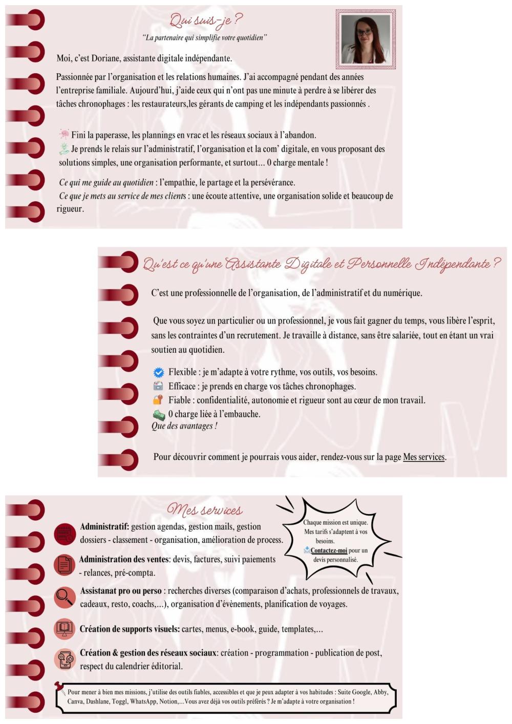 Assistante indépendante, je facilite la vie des professionnels en prenant en charge la gestion administrative, l’administration des ventes, l’assistanat pro/perso, la création de supports visuels et la gestion de leurs réseaux sociaux.