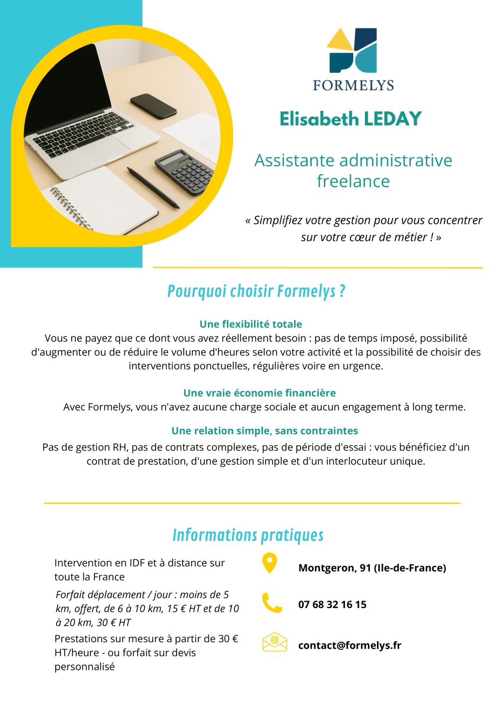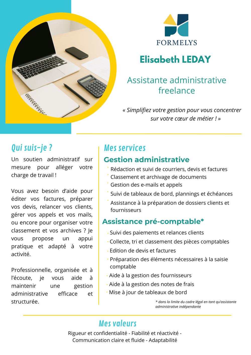 Avant de créer Formelys, j'ai été Assistante pédagogique et commerciale puis Chargée de développement au sein d'un organisme de formation. J'ai également été responsable du management de la qualité pour ce même organisme de formation qui était certifié ISO 9001, NF Services et Qualiopi. Grâce à ces expériences et à mon Titre professionnel de Secrétaire Comptable, j'ai acquis les compétences nécessaires pour apporter un soutien administratif de qualité aux entreprises qui souhaiteraient confier tout ou partie de leurs tâches administratives quotidiennes.