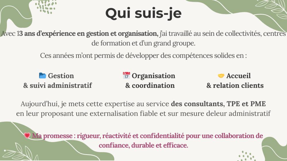Assistante virtuelle avec plus de 13 ans d’expérience en gestion administrative et organisation. J’accompagne consultants, TPE et PME dans la gestion de leurs tâches quotidiennes pour leur faire gagner du temps, alléger leur charge mentale et leur permettre de se concentrer sur le développement de leur activité.