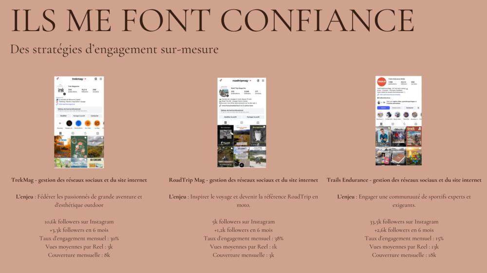 - Medias (Linkedin, Instagram, YouTube, Tiktok). Comptes gérés : TrekMag, RoadTrip Mag, Box'r Mag, SkiMag