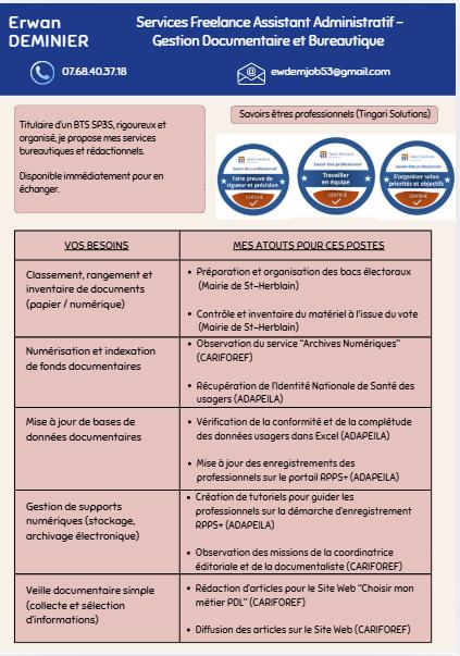 J'ai des compétences bureautiques et rédactionnelles importantes : j'ai pu faire un stage dans un service de gestion documentaire et d'archives numériques auprès d'une coordinatrice éditoriale et d'une documentaliste. Le classement, l'organisation, la rédaction et la communication visuelle, ça me connaît.