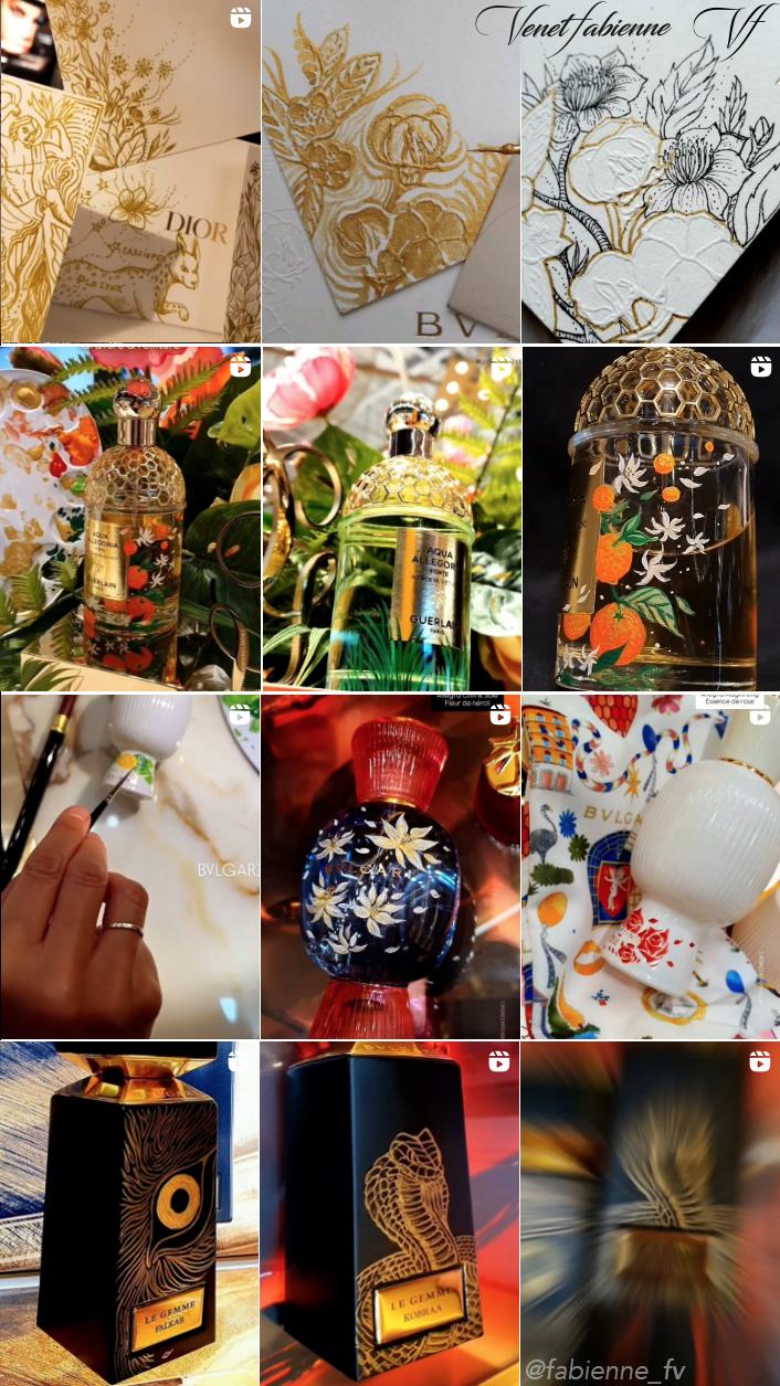 Gravure sur parfums, Calligraphie, Illustration, peinture sur verre, cuir, dorure à chaud, feuille d'or...