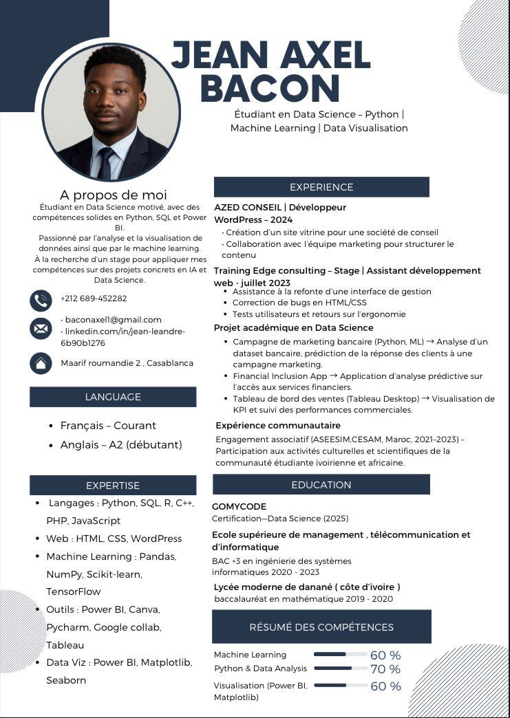 Data scientist passionné, spécialisé en analyse de données, machine learning et modélisation. J'aide les entreprises à exploiter leurs données pour en extraire des insights précieux et optimiser leur prise de décision. Rigoureux et orienté résultats, je suis toujours à la recherche de défis où je peux appliquer mes compétences pour créer de la valeur à partir des données. Mon objectif est de transformer les données en solutions concrètes et impactantes pour améliorer la performance et l'innovation.