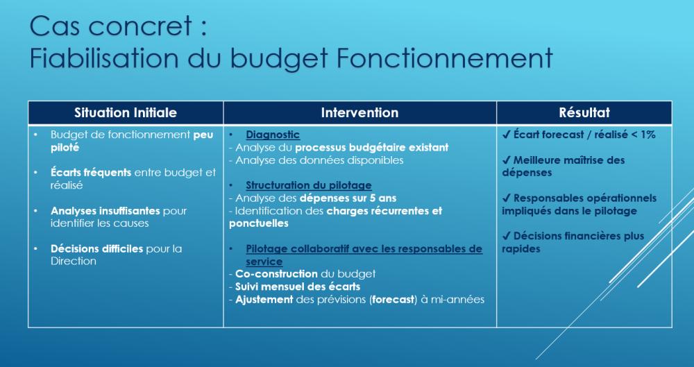 • Structuration et mise en œuvre d’une organisation budgétaire, avec sensibilisation des managers aux enjeux financiers et à la maîtrise des consommations