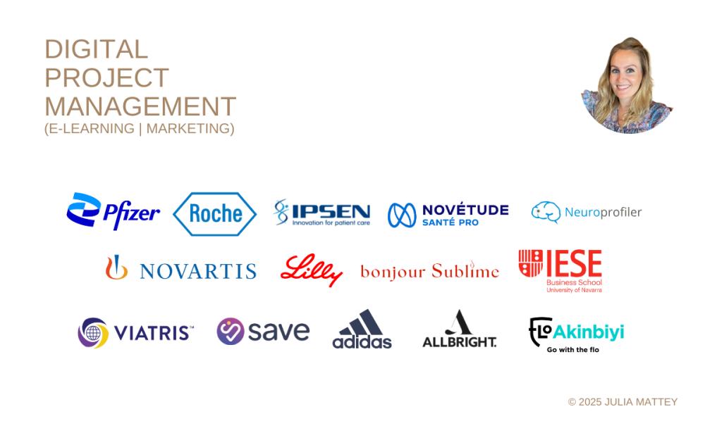 J’ai collaboré avec des marques telles que Adidas, Viatris, Novartis, Pfizer, Roche et d’autres grands acteurs internationaux pour créer des contenus stratégiques, des parcours de formation engageants et des supports de communication clairs et conformes.