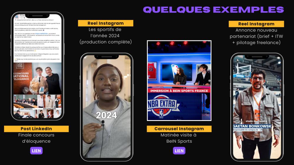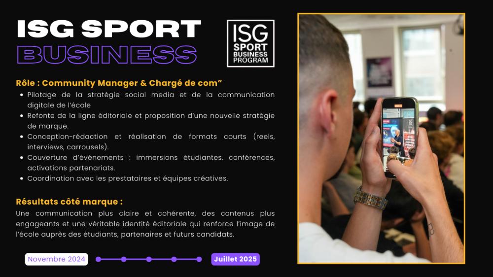 Plus récemment, j’ai travaillé à l’ISG Sport Business Management comme Community Manager & Chargé de communication digitale, où j’ai piloté la stratégie social media, géré la couverture d’événements sportifs et produit des contenus à forte valeur ajoutée. 💼