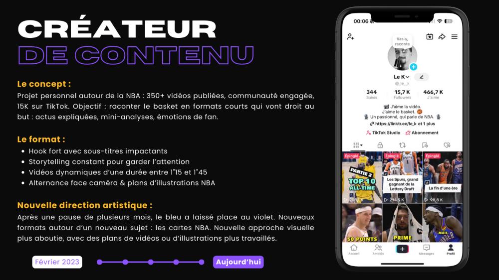 Avec Le K, mon projet de création de contenu (350 vidéos publiées en 2 ans et demi - 15K abonnés sur TikTok), j’ai développé une expertise sur les formats courts et la manière de raconter le sport de façon engageante. 🎥