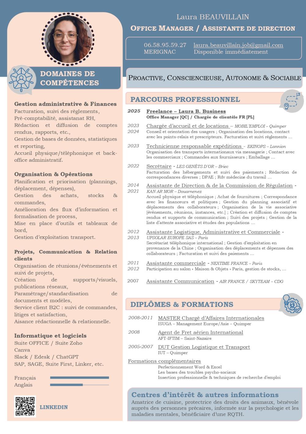 Office manager et assistante de direction externalisée, basée à Bordeaux et travaillant pour l'international (FR-EN), j'accompagne les artisans et dirigeants de PME dans la gestion quotidienne de leur back-office. De la facturation et rapprochements bancaires à la relance client, de l'organisation d'agenda à la logistique export, de la création visuelle à la rédaction de newsletter, j'assure un service sur-mesure pour libérer votre temps et sécuriser vos processus.
