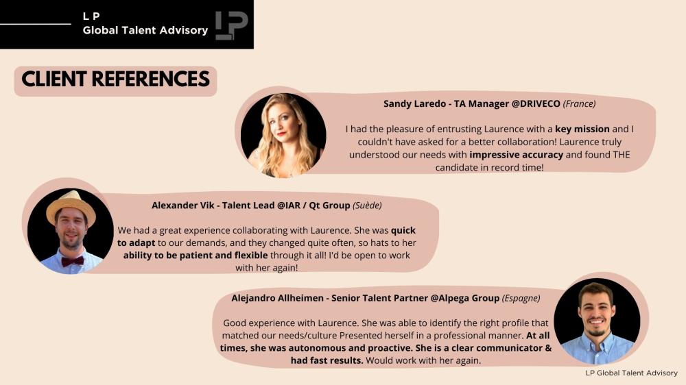 Plus de 15ans d'expériences internationales en Talent Acquisition en cabinet de chasse de tête et au sein d'entreprises comme TheFork / Tripadvisor, je me dédie aujourd´hui à l'accompagnement de mes clients sur des missions de chasse ou comme addition à l'équipe talent acquisition.