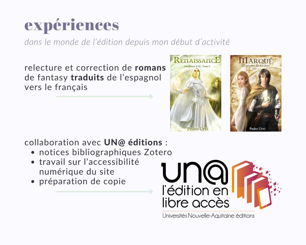 Après un parcours en CPGE littéraire puis en fac de lettres jusqu'au master, je crée mon entreprise d'abord pour effectuer diverses missions auprès de la plateforme UN@ proposant des publications universitaires en libre accès. Depuis, je développe mon activité avec pour principales missions des relectures de romans, de la préparation de copie sur des ouvrages scientifiques (de sciences humaines) et de la correction formelle (orthographe, grammaire, conjugaison). Je propose également un travail de lecture sensible, d'aide à l'écriture et de commentaire critique. Ces offres sont cumulables et complémentaires.