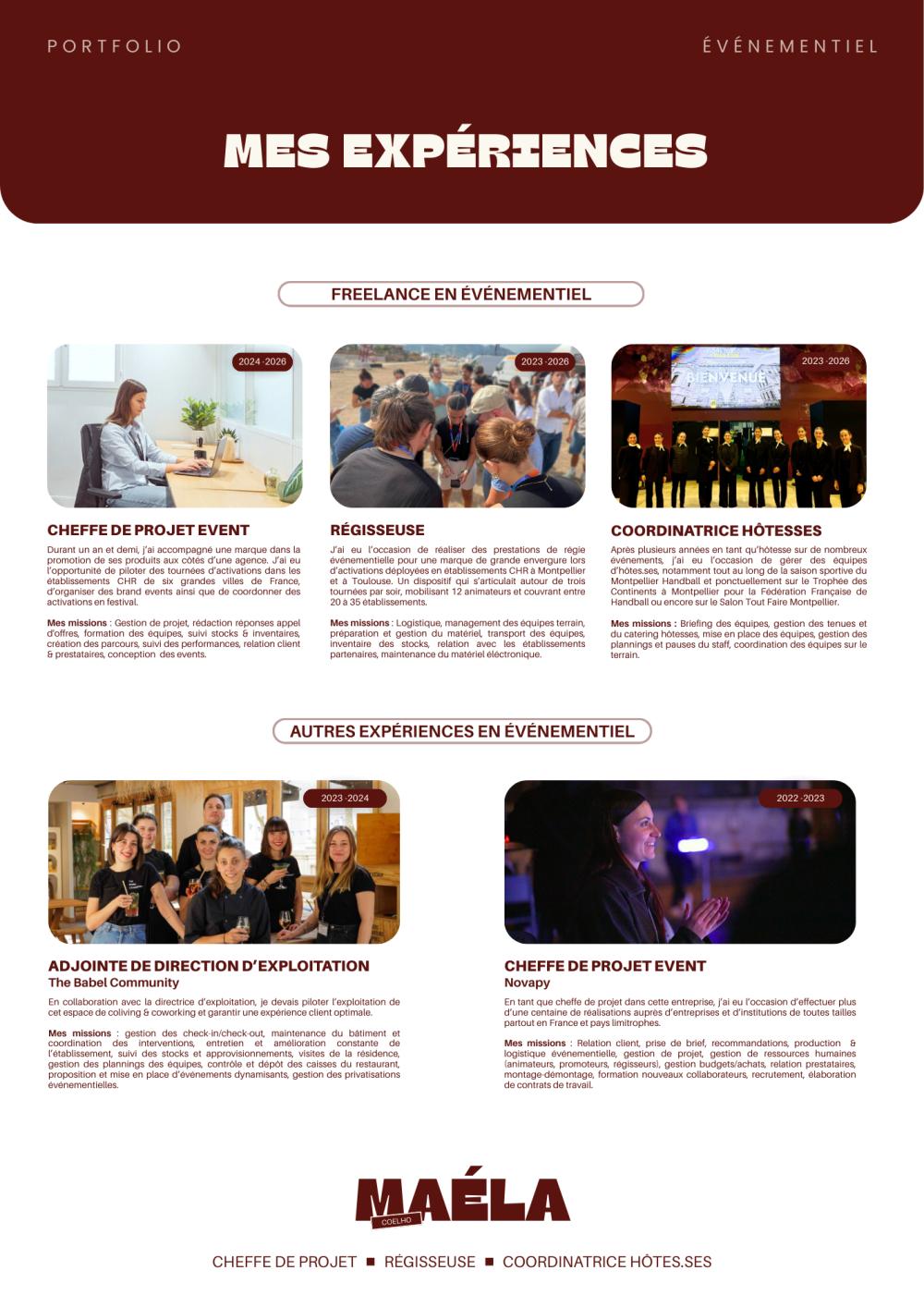 Après plusieurs années en tant qu’hôtesse sur de nombreux événements, j’ai eu l’occasion de gérer des équipes d’hôtes et hôtesses, notamment tout au long de la saison sportive du Montpellier Handball et ponctuellement sur le Trophée des Continents à Montpellier pour la Fédération Française de Handball ou encore sur le Salon Tout Faire Montpellier.
