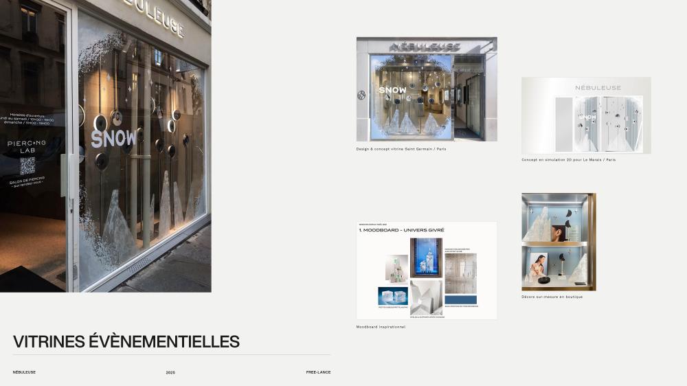 J’ai ensuite poursuivi avec une spécialisation en visual merchandising, orientée vers la scénarisation des espaces de vente et la mise en valeur des marques.Une continuité avec mon premier cursus artistique.