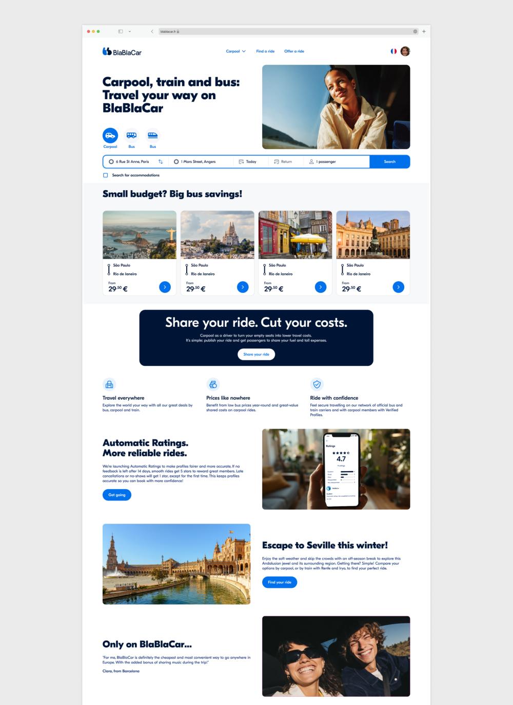 J'ai travaillé sur des campagnes marketing internationales et sur la direction artistique des différentes marques de BlaBlaCar. J'ai effectué un rebranding complet en 2018 ainsi qu'un refresh de la marque en 2025.