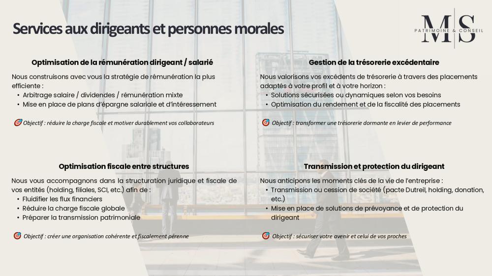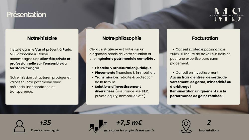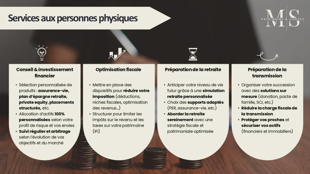 Mon approche repose sur une analyse globale et sur mesure : audit patrimonial, stratégie d’investissement, ingénierie financière et solutions fiscales adaptées.