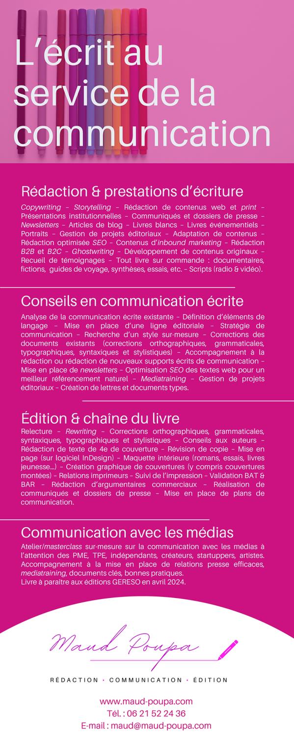Consultante éditoriale & rédactrice indépendante, j’accompagne les entreprises, les médias et les acteurs culturels dans la création de contenus écrits à forte valeur ajoutée : rédaction web & print, communication B2B, B2C et B2B, prête-plume et ghostwriting. Autrice de nombreux livres, je transforme les idées de mes clients en textes qui leur ressemblent et les mettent en valeur.