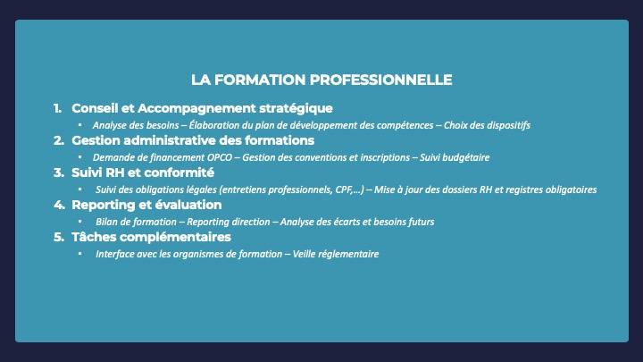 Gestion de la formation professionnelle (Budget de 20k€, plan de développement, recherche et mise en place des formations, etc...)