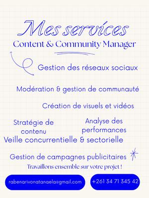 Community manager Communication digitale Création bannière Graphisme Prospectus Rédaction Rédaction web Relecture Stratégie éditoriale