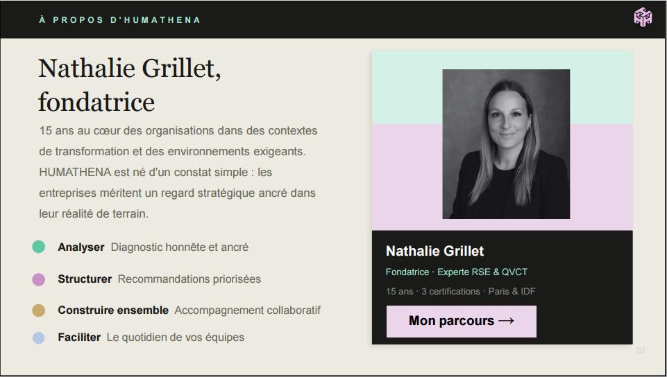 đ§Ma valeur ajoutĂ©e : une double expertise opĂ©rationnelle et stratĂ©gique. Mon parcours combine une expĂ©rience d'office manager et responsable RSE de prĂšs de 15 ans (et experte en montage d'appels d'offre) avec une expertise de consultante en QVT et sujets organisationnels.