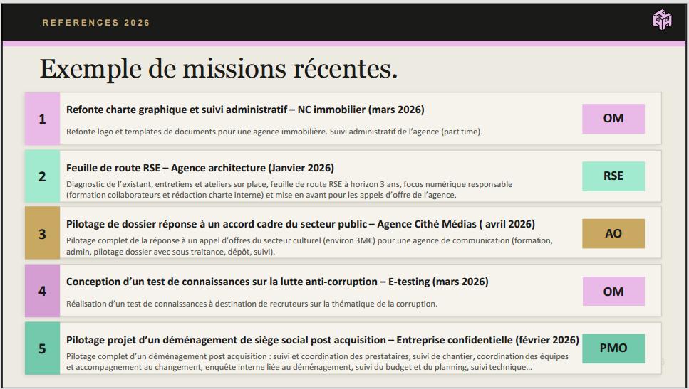 Depuis octobre 2025 : Activité en freelance (références récentes dans mon portfolio)