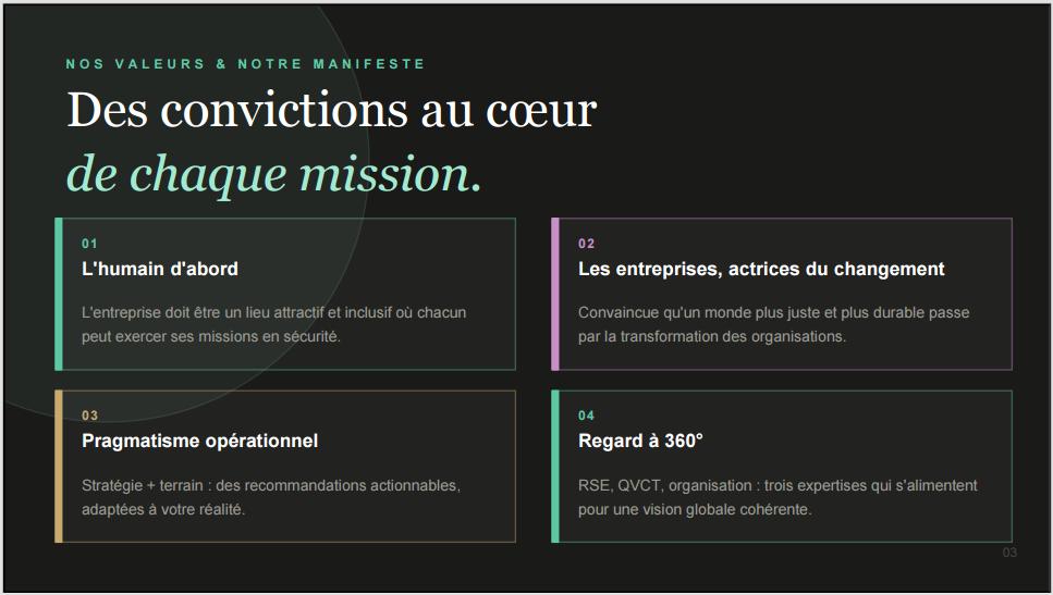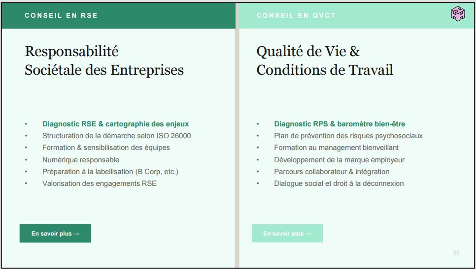 -Conseil, accompagnement Ă la transformation interne de vos pratiques : conseil en RSE/RSO, numĂ©rique responsable, QualitĂ© de Vie au Travail, enquĂȘte de climat interne et des risques psychosociaux, diagnostics liĂ©s aux process et outils...