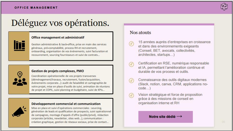 AprÚs 15 années auprÚs d'entreprises de différents secteurs (cabinets de conseil, agence architecture, collectivités, cabinets d'avocats) je me suis lancée en freelance pour aider les dirigeants et leurs équipes au quotidien.