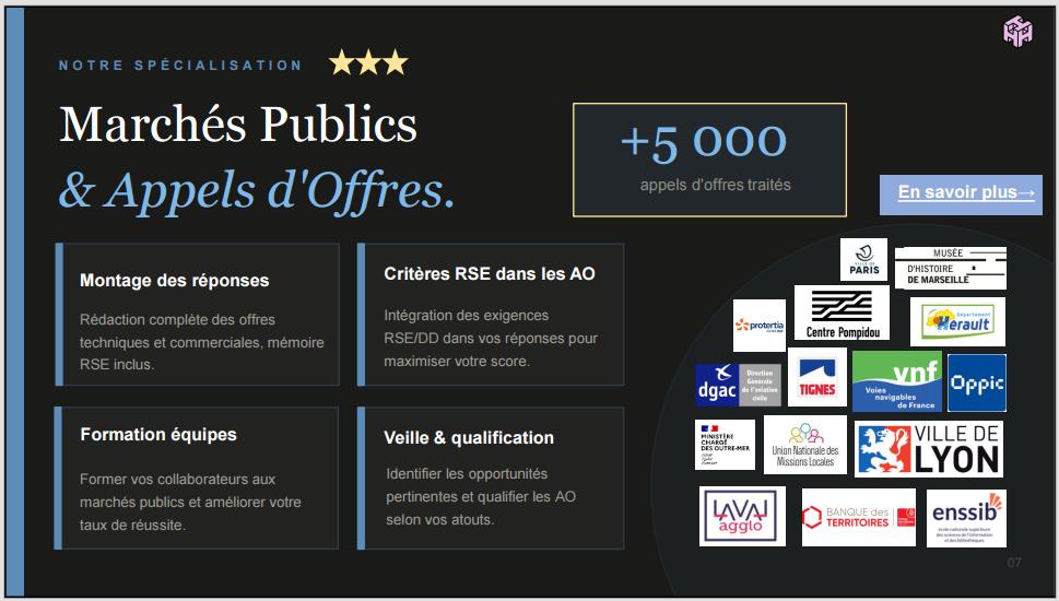 -Appels d'offres : pilotage complet et gestion de montage complexe, formation des éuqipes, rédaction mémoire technique et intégration volets environnementaux et sociaux, amélioration des notations et suivi qualité, veille et sourcing partenaires...
