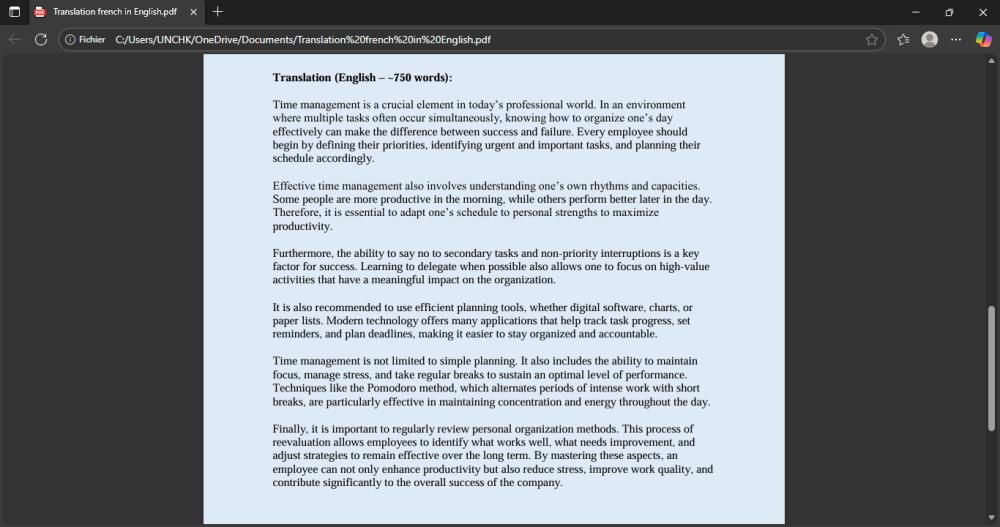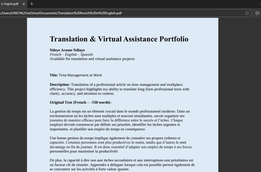 J’ai déjà participé à quelques projets de traduction (français ↔ anglais) et de transcription, et je peux également aider dans des tâches d’assistance virtuelle comme la gestion de documents ou le suivi administratif.