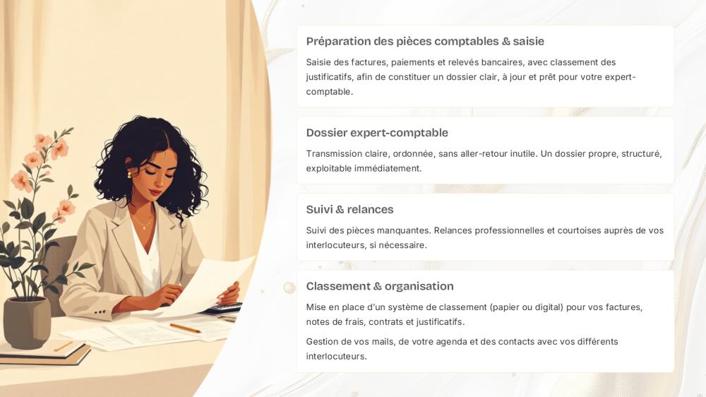 Comptable de formation, j’ai travaillé pendant plus de 6 ans en cabinet d’expertise comptable auprès d’indépendants, de TPE et de PME. J’y ai géré l’organisation de leur administratif et le suivi comptable du quotidien, ainsi que diverses missions comme la préparation des bilans, les déclarations fiscales et certaines formalités juridiques.