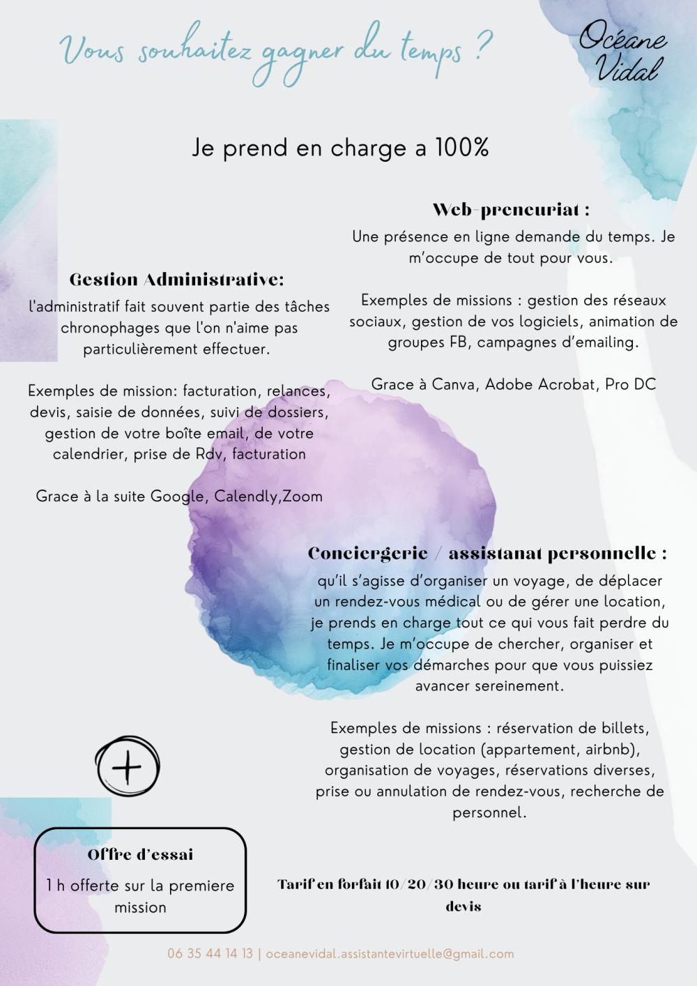 Exemples de mission: facturation, relances, devis, saisie de données, suivi de dossiers, gestion de votre boîte email, de votre calendrier, prise de Rdv, facturation