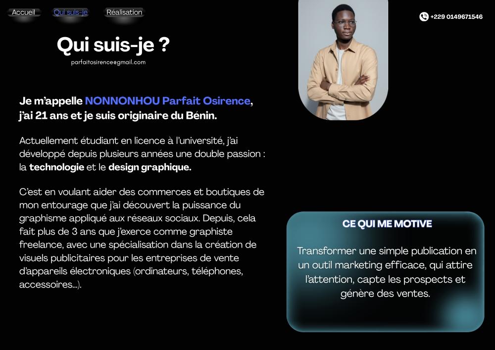 Je m'appelle Parfait NONNONHOU, je suis graphiste professionnel depuis grâce année. J'accompagne des entreprises et boutiques de ventes d'appareils électroménagers et électroniques à augmenter leurs ventes grâce à une meilleure gestion de leurs différents canaux d'acquisition, notamment les réseaux sociaux et grâce à des affiches qui font vendre.