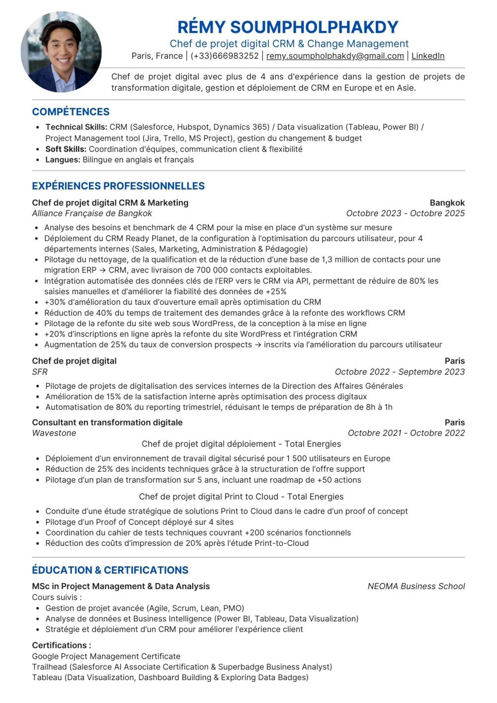 Chef de projet digital ayant plus de 5 ans d'expérience dans la direction de projets digitaux pour des entreprises internationales. Que vous ayez besoin de quelqu'un pour structurer des processus, gérer des équipes interfonctionnelles ou mener à bien un projet de migration ou gestion de CRM.