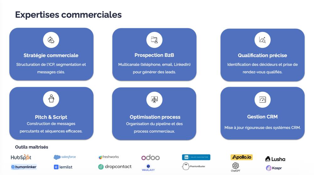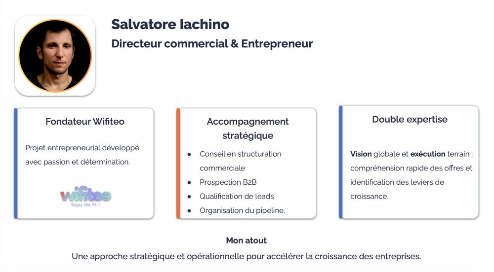 Je suis consultant en stratégie commerciale et directeur commercial externalisé. J’accompagne les entreprises dans la structuration de leur organisation commerciale, la clarification de leur offre et la génération d’opportunités qualifiées. Mon approche combine vision stratégique, exécution terrain et rigueur opérationnelle pour accélérer la croissance. J’interviens aussi bien sur le pilotage commercial que sur la prospection B2B, la qualification, la gestion du pipeline et l’optimisation des process.