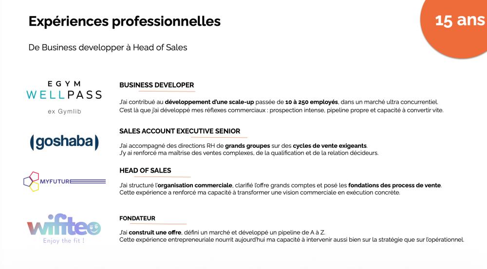 - Parcours entrepreneurial : création d’une offre, structuration du go-to-market, développement commercial complet et pilotage stratégique.