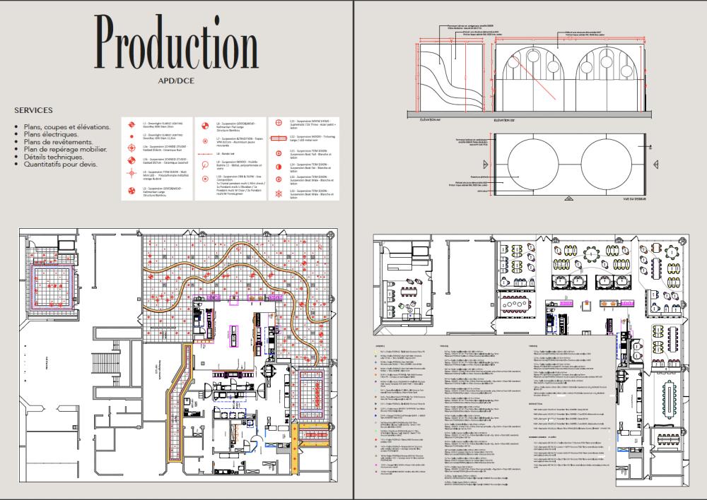 • Production de dossiers APS à DCE (plans, coupes, élévations et détails techniques).