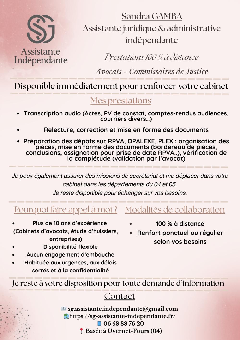 Assistante juridique et administrative indépendante, forte de plus de dix ans d’expérience en cabinets d’avocats, études d’huissiers et entreprises privées. J’accompagne les professionnels dans leurs besoins en transcription audio et gestion administrative avec discrétion et fiabilité. Mon objectif est d’apporter un appui solide et de simplifier le quotidien des cabinets, études et entreprises.