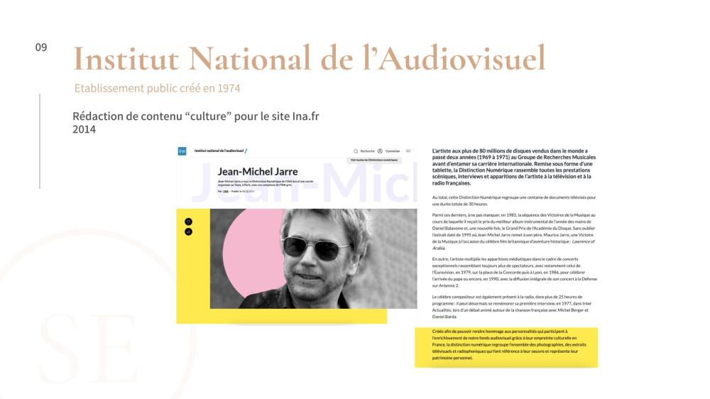 Gestion des événements et développement de partenariats institutionnels et culturels : réalisation d’outils print, scénographie et réalisation de stands, coordination logistique, relations presse et partenaires pour la mise en valeurs des différentes activités de l’INA : formation professionnelle, numérisation des archives audiovisuelles, plateformes éducatives et mémorielles, etc.