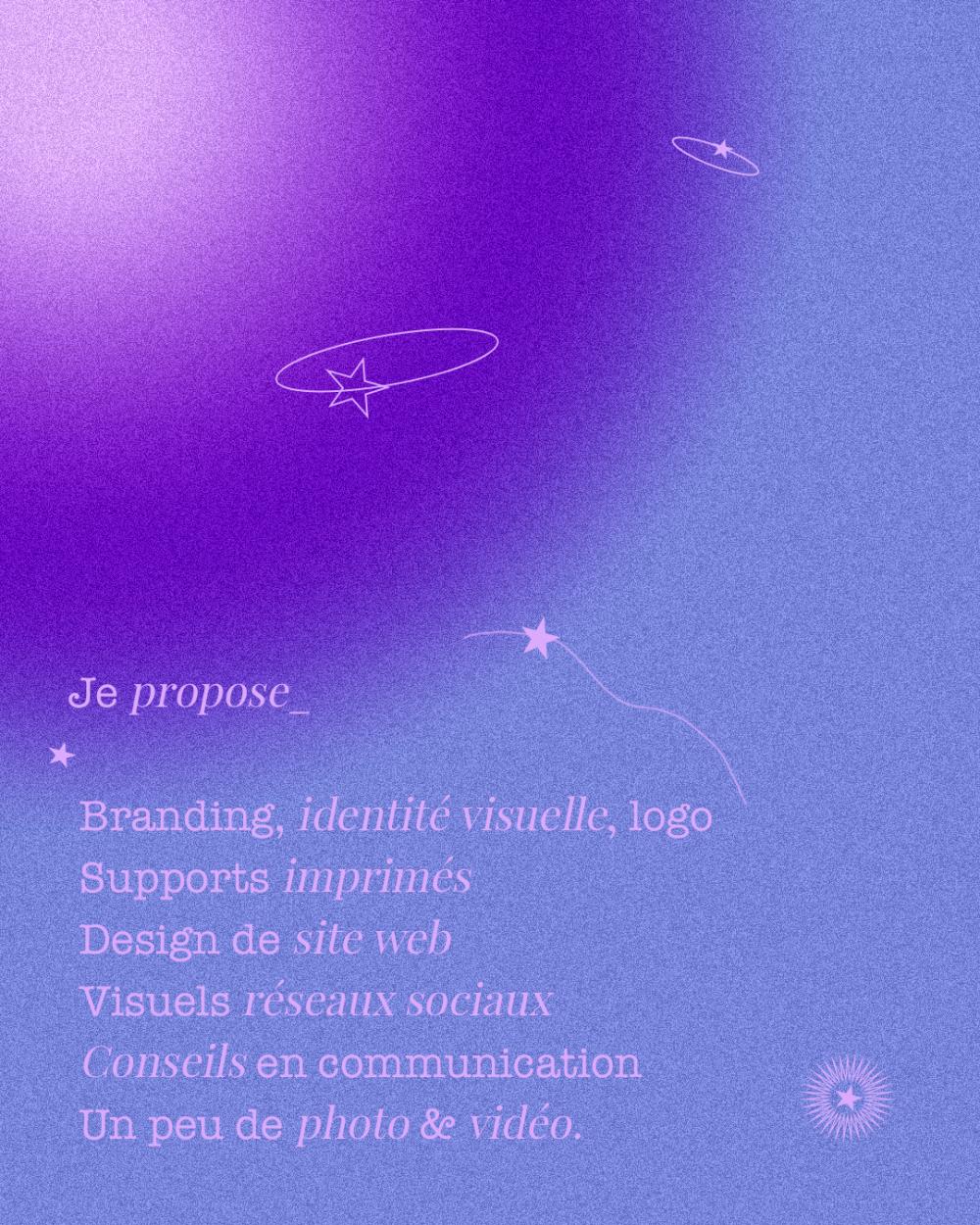 Je propose: branding, identité visuelle, logo, supports imprimés, design de site web, visuels réseaux sociaux, conseils en communication, un peu de photo et de vidéo.