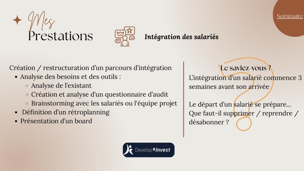 Mon petit + : Convaincue de l'utilité du parcours d'intégration, je suis en mesure de vous conseiller sur les étapes clés qui permettront une mise en confiance, de comprendre rapidement la culture de l'entreprise et ses processus internes. Grâce à des formations adaptées et à une transmission efficace des savoir-faire, le salarié devient opérationnel plus rapidement.