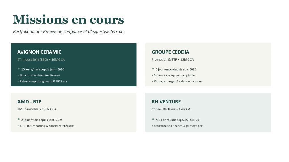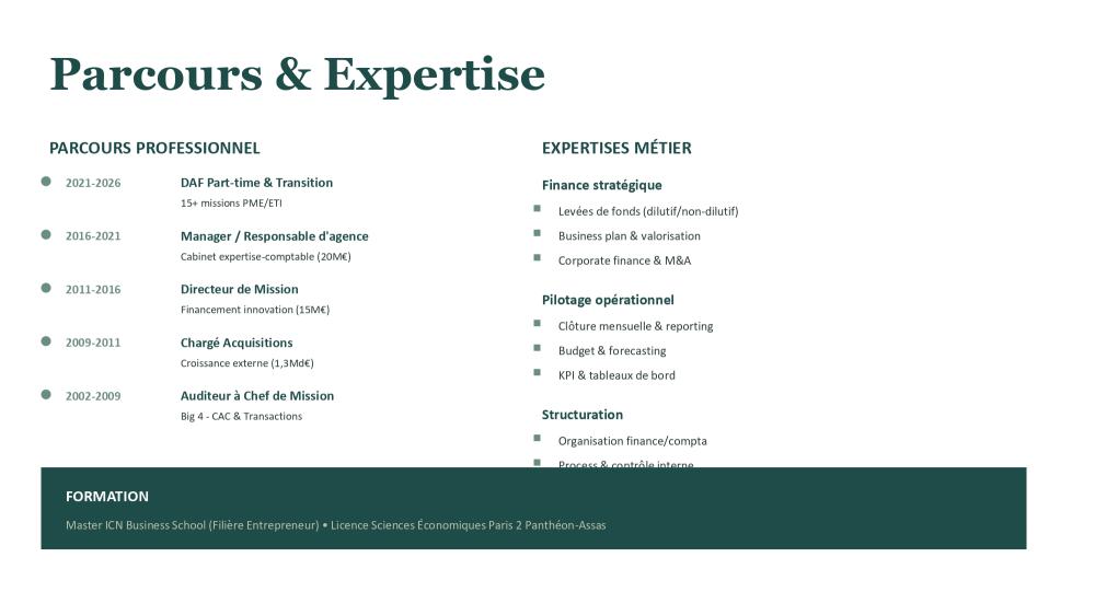 Production mensuelle de tableaux de bords, prévisionnel de trésorerie - Supervision de la comptabilité - Conseil financier et stratégique – Gestion des relations avec les tiers (Administration, Banques, Investisseurs, CAC, …) – Accompagnement à la levée de fonds (dilutive et non dilutive) – Gestion administrative, financière et juridique : Comptabilité / Facturation – recouvrement / Contrats commerciaux et de travail / Déclarations fiscales et sociales & Gestion de la paie